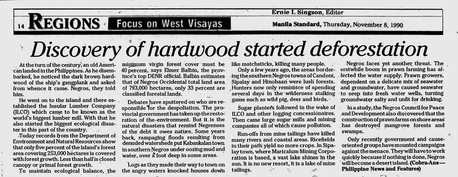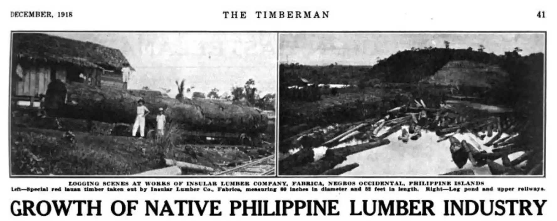 While many suffered from the floods and deforestation, the hacenderos reaped substantial benefits. The clearing of forestlands provided them with available area to expand their holdings. In fact, some hacenderos even invited lumber companies to clear forests for agricultural expansion. This was part of ILCO’s genesis and convenient placement in the middle of the forests of northern Negros. The upstart Gil Lopez was able to acquire 1,500 hectares of land from the government, which he subsequently cleared with the help of ILCO. According to his grandniece Maria Lina Santiago, Lopez “invited American businessmen to infuse the capital needed for the development of wood products. As a result, Fabrica Insular Lumber Company was established.” The aged trees that made up the “dense and impenetrable” forests were no match for this onslaught. So wholesale was the destruction that even the native wildlife, like “gigantic pythons were not spared.” Moreover, the speed and scale by which Lopez and ILCO destroyed the forest was so sweeping that Santiago describes ILCO, almost with a touch of pride, as “the biggest hardwood company in the world then.”20